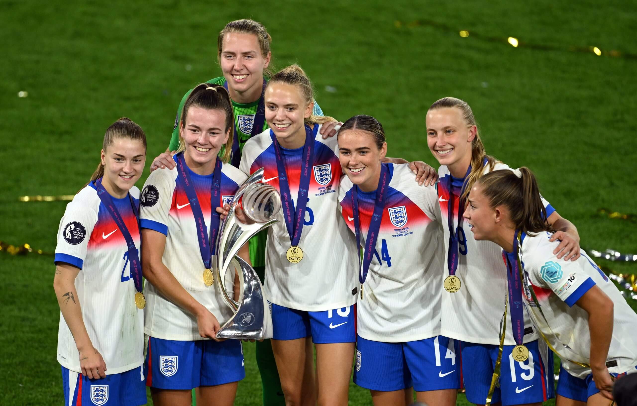 Esme Morgan (C) celebrates with teammates after beating Spain in the Euro 2025 final. (Matthias Hangst/Getty Images)