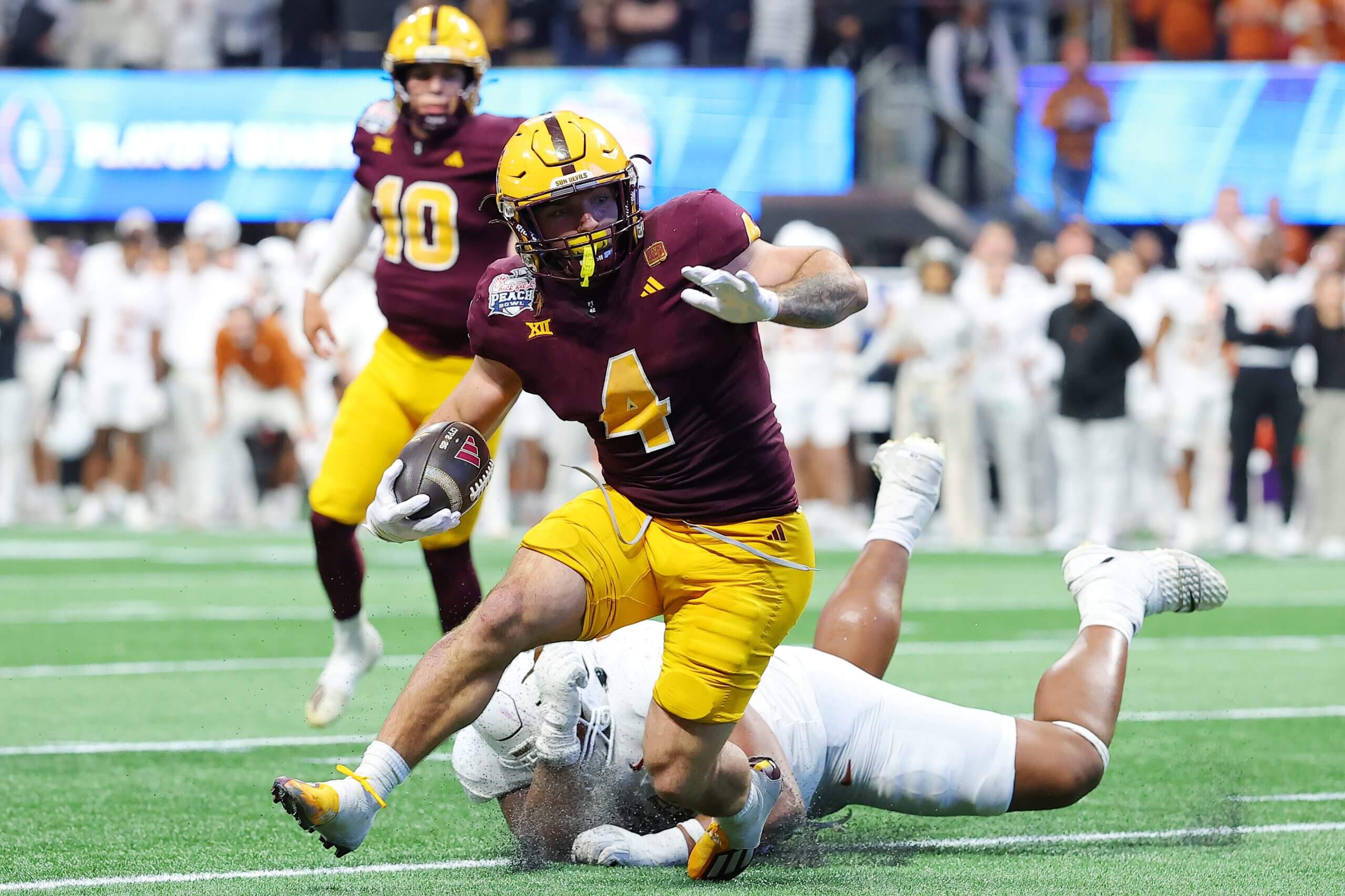 Cam Skattebo runs in the tying two-point conversion for Arizona State during the fourth quarter against Texas in last season’s Peach Bowl. (Kevin C. Cox / Getty Images)