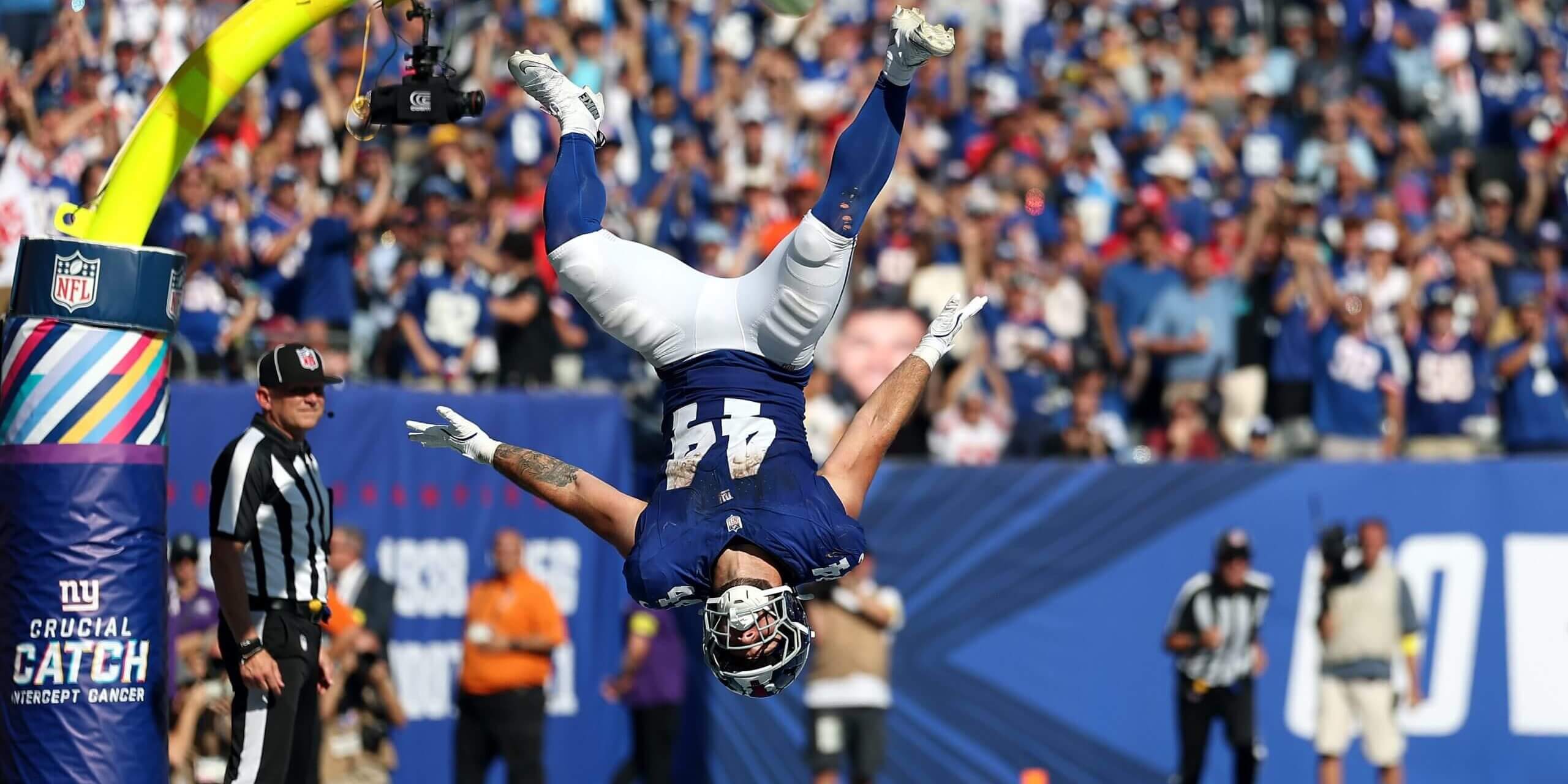 Cam Skattebo goes airborne after a two-point conversion against the Los Angeles Chargers. (Ishika Samant / Getty Images)