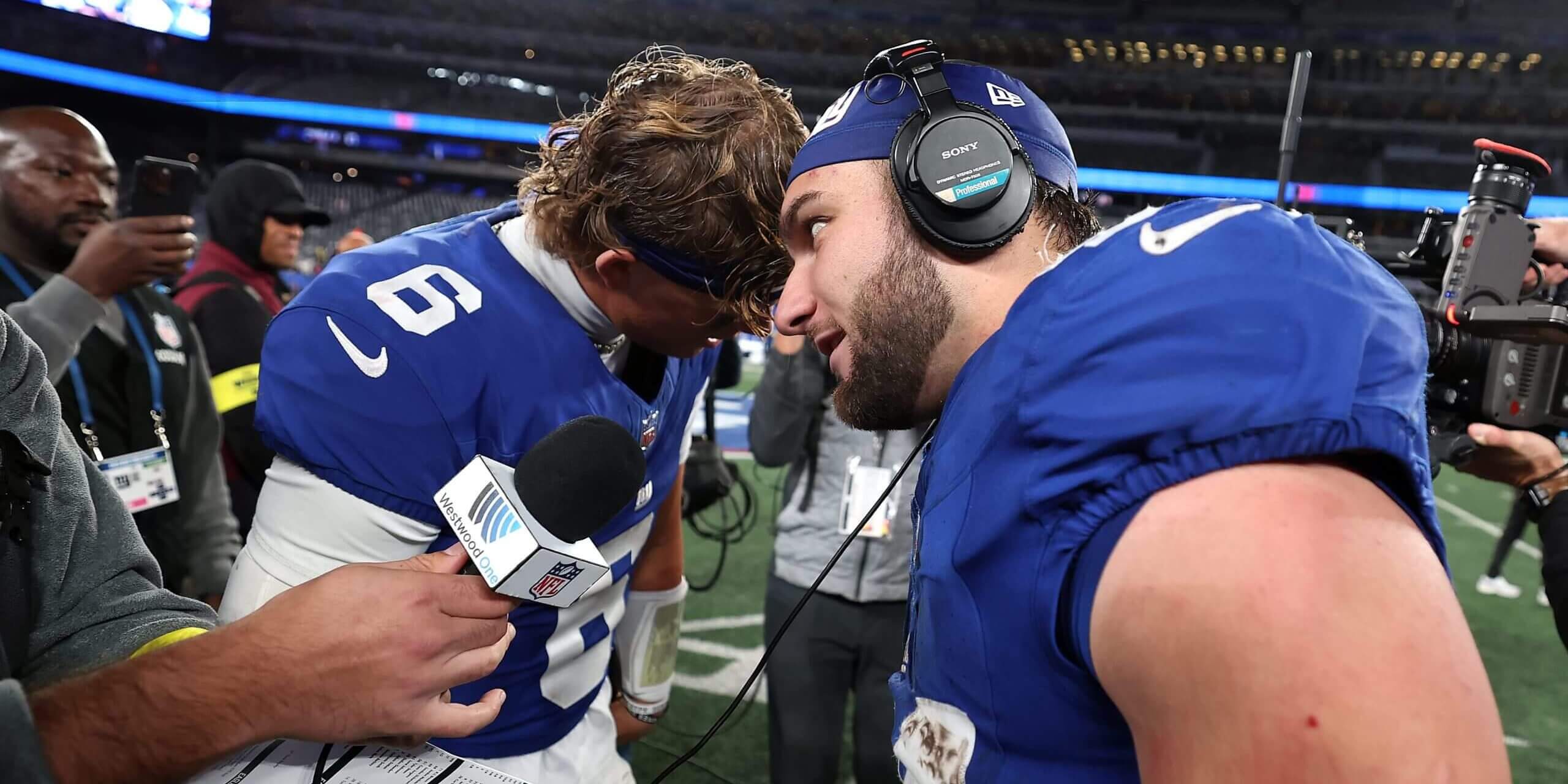 Jaxson Dart (6) bumps heads with Skattebo after the Giants defeated the Eagles 34-17. (Al Bello / Getty Images)