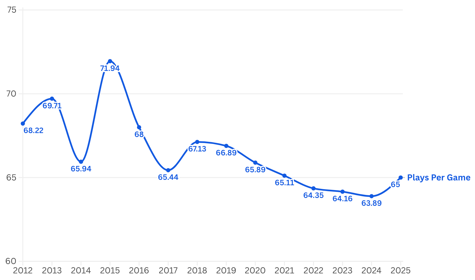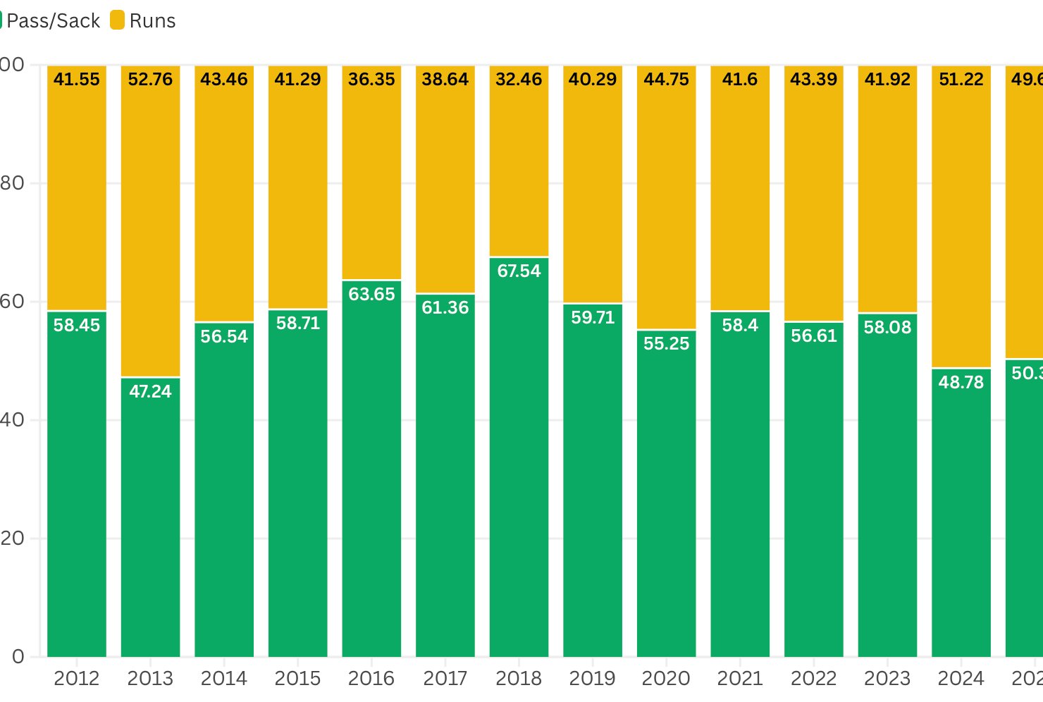 It’s not a huge decline, year over year, but it’s definitely a downward trend. The Packers are running fewer plays a given game now than they were in the mid to late Mike McCarthy era. And don’t be fooled by the uptick in 2025; that’s skewed by the 83 plays the Packers ran in their tie game with the Dallas Cowboys. Outside of that game, the Packers are averaging a mere 60.5 plays per game.
