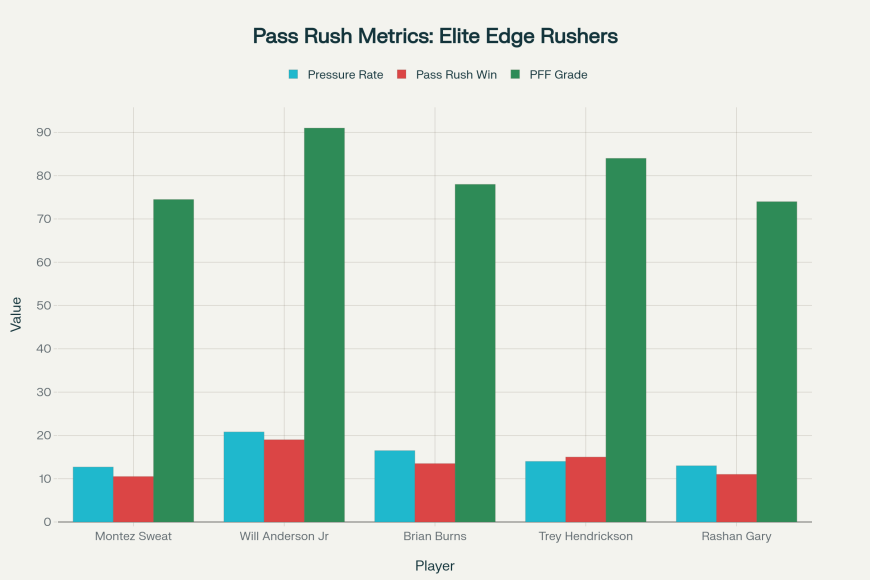 Sweat’s pressure rate is hovering at 12.3% (NFL Next Gen) or 14.1% (PFF). That’s average at best. Compare that to Will Anderson Jr.’s 20.8% or Hendrickson’s career 17.4%, and you’re talking about a massive drop-off. The pass rush win rate is where things hit rock bottom: Sweat clocks in at