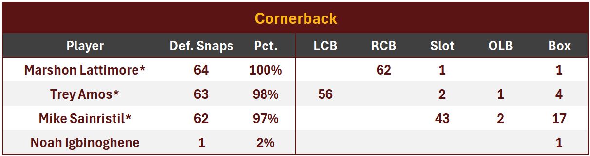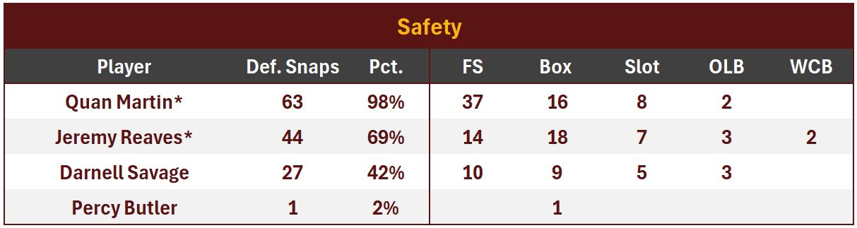 Darnell Savage was given more playing time and rewarded the Commanders with increased production. He made 2 tackles and 2 assists with 1 stop and 1 missed tackle, and generated a QB hurry on his lone pass rush attempt from the OLB position. He was targeted twice in 16 coverage snaps and allowed 1 reception for 1 yd.