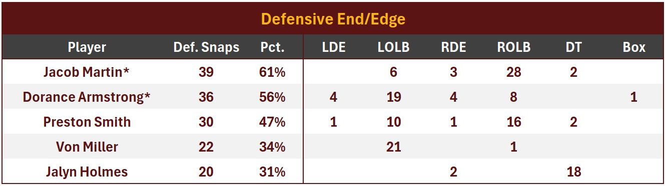 Current Commander/former Redskin Preston Smith got more playing time and made more impact this week, according to PFF, who counted 1 tackle, 1 assist and 2 hurries. PFR just counted 2 assists and no pressures.