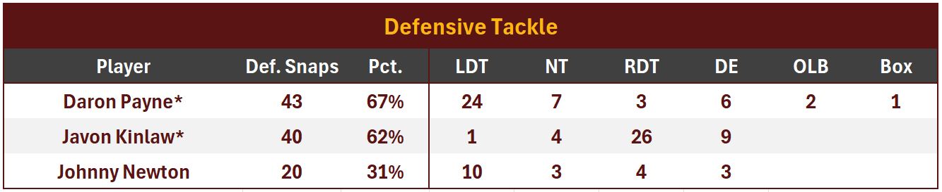 Daron Payne made 2 tackles and 3 assists with 3 defensive stops. PFR counted 1 missed tackle, but not PFF. He generated 1 pressure in the pass rush.