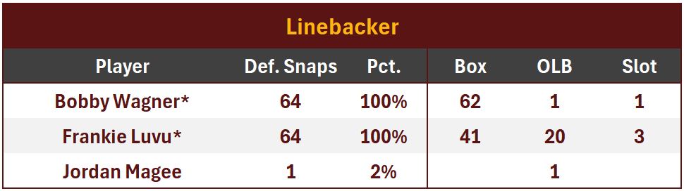 Bobby Wagner led the team in combined tackles, with 4 tackles, 5 assists and 1 TFL per PFR, or 7 tackles, 4 assists and 3 stops per PFF. He also generated 1 hurry on 4 blitzes.