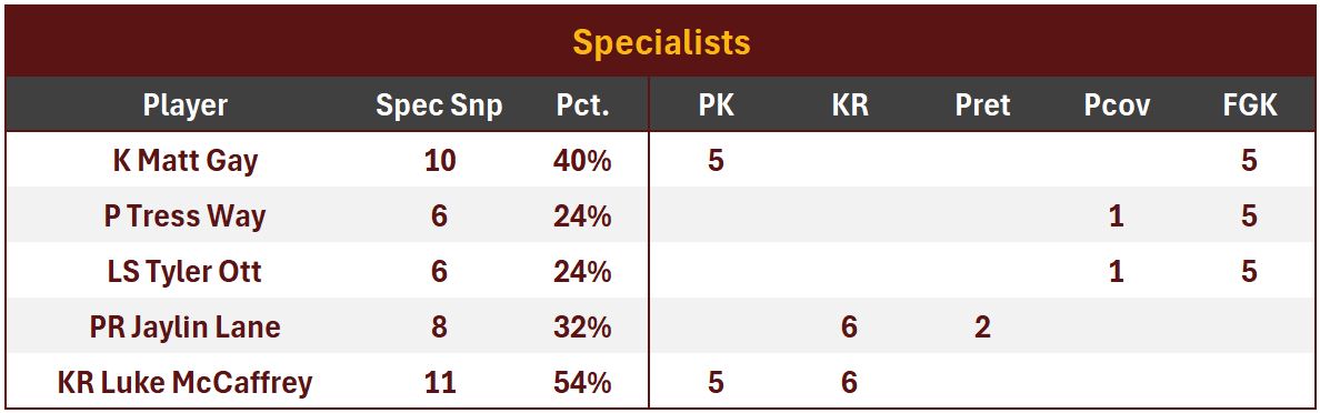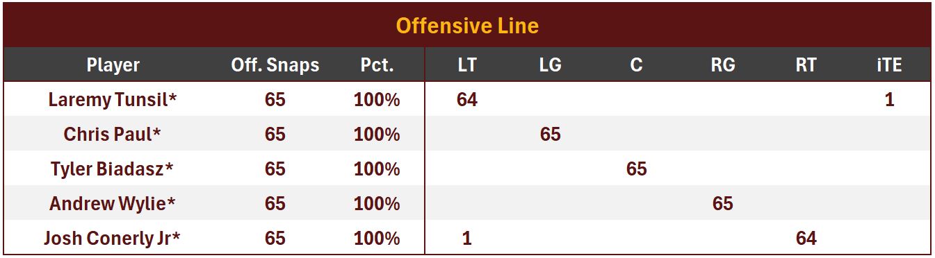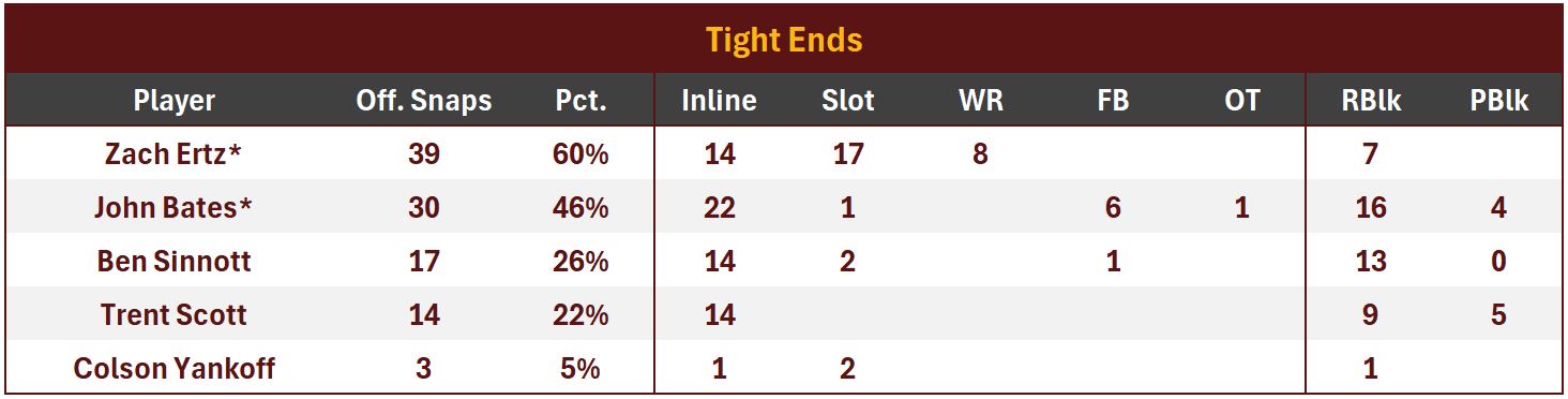 Someone commented last week about the pleasing cascading effect of the snap counts by position table. The Commanders made slight tweaks to the pattern this week, with Josh Conerly taking 1 snap at LT and Laremy Tunsil moving out to inline TE for a snap. Three of the four linemen played well in pass protection. Run blocking remains an area for improvement as judged by RBs’ YBC, as discussed in the RBs section.