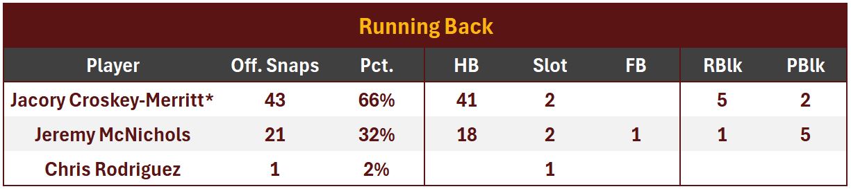 Jacory Croskey-Merritt assumed the lead back role with 17 rushing attempts for 61 yds (3.6 Y/A), 4 first downs and 1 broken tackle, with 1 lost fumble (Success Rate 47.1%).