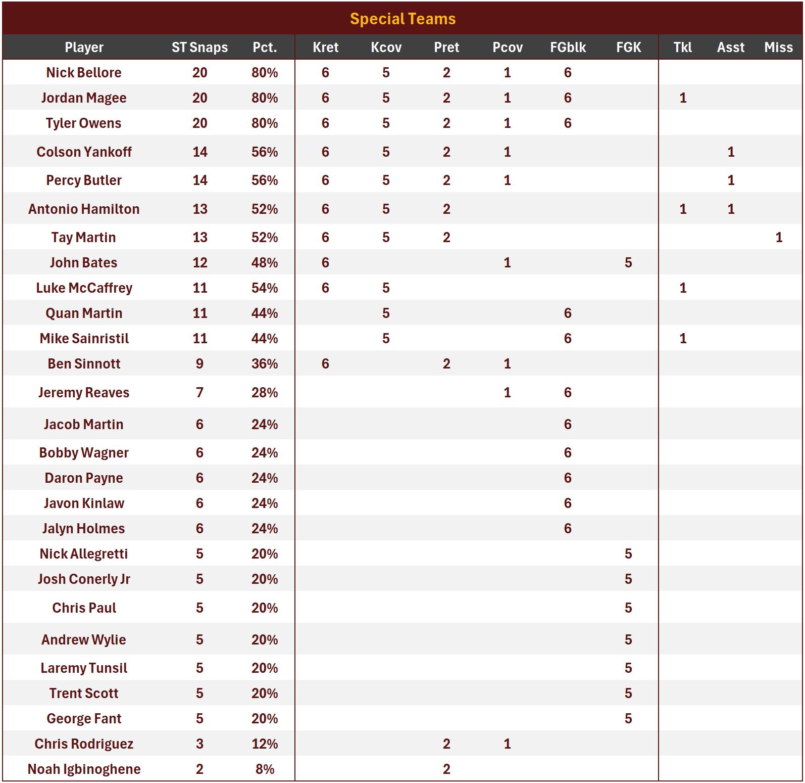 Daron Payne made the play of the week on special teams, by blocking a field goal on the first play of the fourth quarter to preserve the Commanders’ 17-16 lead. A lot of fans might not even realize that he plays on special teams. But Daron has been a regular on field goal block units throughout his career. For some reason blocked field goals and punts are not recorded as stats by the NFL or any of the major stats services.