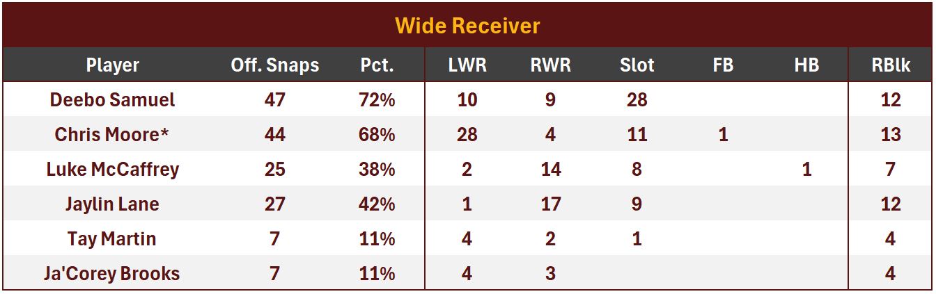 Hands up in the comments if you picked Chris Moore to lead the Commanders in receiving yards. Moore caught 3/5 targets (60%; ADOT 12.2 yds) for 46 yards, 3 first downs and 1 TD on a highlight reel catch with an acrobatic move to make two point of contact inbounds. He caught 2 of 3 contested targets and dropped 1 pass. Moore was the Commanders’ fourth most productive receiver at a respectable 1.77 Y/RR.