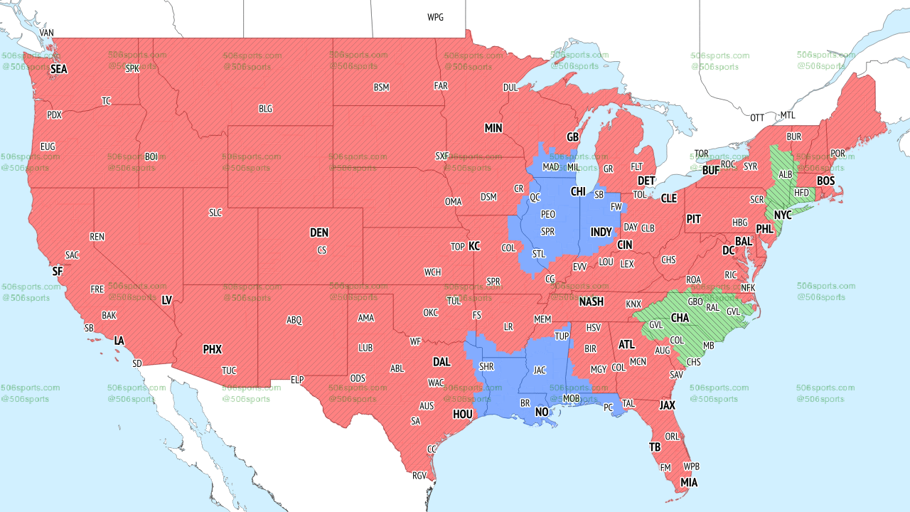 If you are outside of the red areas, you’ll have to find the game via YouTube NFL Sunday Ticket.