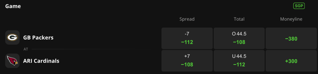 Green Bay is a seven-point favorite and -380 on the moneyline, while Arizona is +300 on DraftKings Sportsbook. The game total is set at 44.5 points.