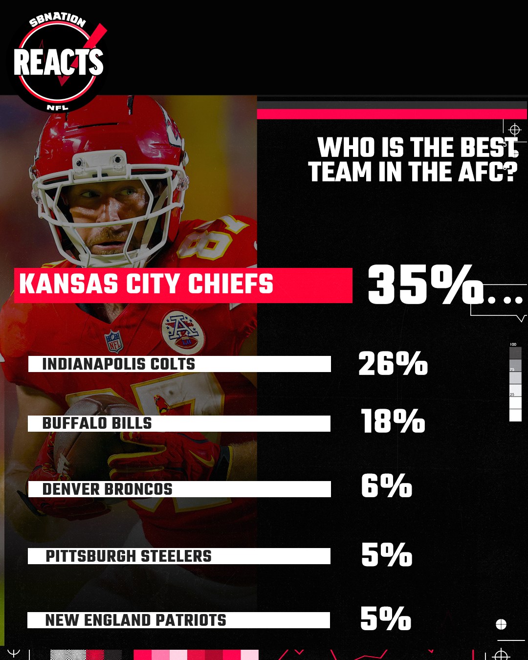 Outside of the fan base (and, yes, those 17% of confident Bills voters) things look much better for Buffalo’s chances. Observers have shown some concern about the team, but long-term confidence remains — suggesting many believe the Bills are again playoff bound. That said, look which AFC team leads the polling as the best team in the conference…