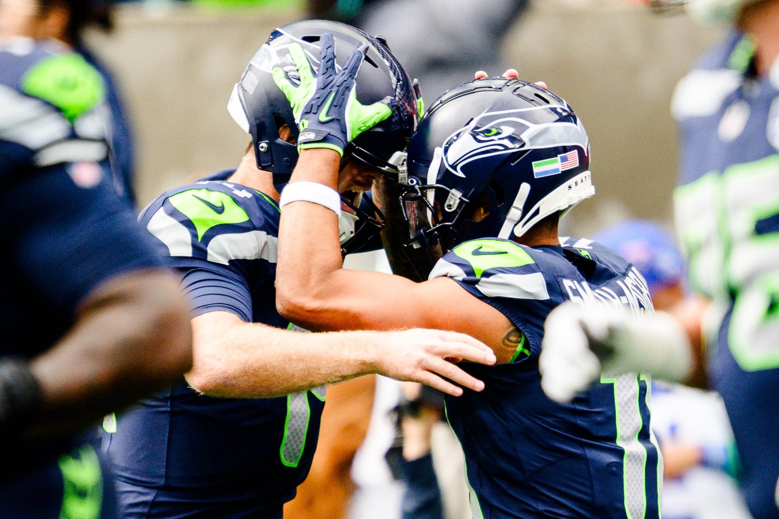 The connection between Jaxon Smith-Njigba, right, and Sam Darnold couldn’t have gone much better to start the 2025 season. Jane Gershovich / Getty Images
