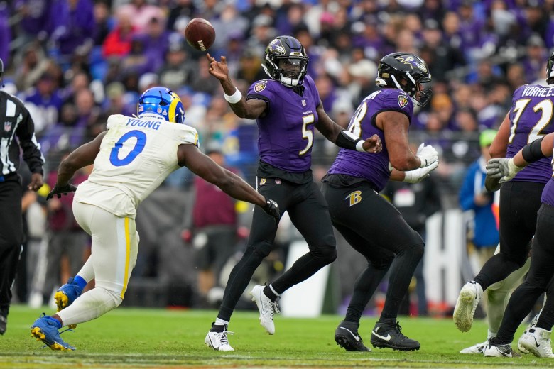 Baltimore Ravens quarterback Tyler Huntley (#5) attempts a pass as Los Angeles Rams linebacker Byron Young (#0) rushes in during the second half. (AP Photo/Stephanie Scarbrough)