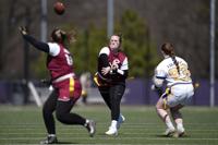 University of Northwestern St. Paul and University of Wisconsin-Stout players compete during a women’s college flag football game on April 7 in St. Paul. Minn.