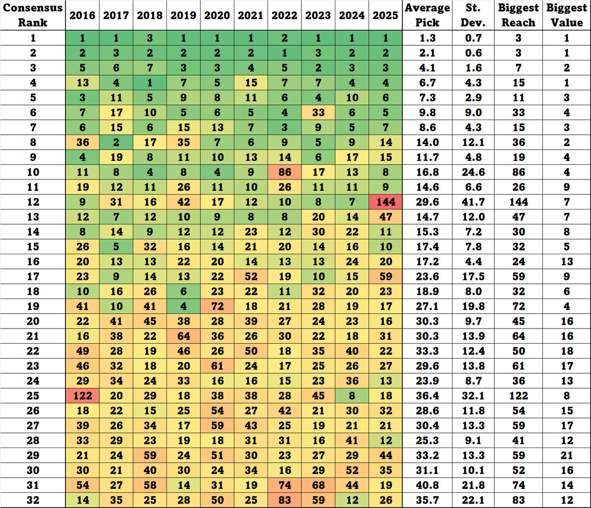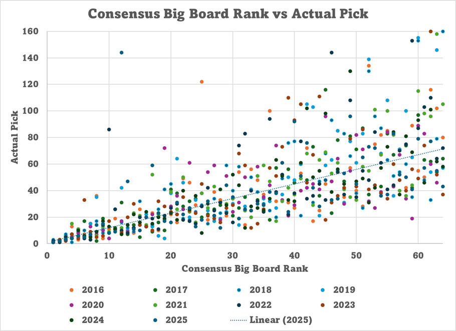 The takeaway from all of this is that even the consensus big board, with loads of data like they had in 2025, is wrong more often than it was right, even in the top 10. Shadeur Sanders falling to 57th round doesn’t help the accuracy for 2025, but even removing him, the big board was still fairly inaccurate in 2025.