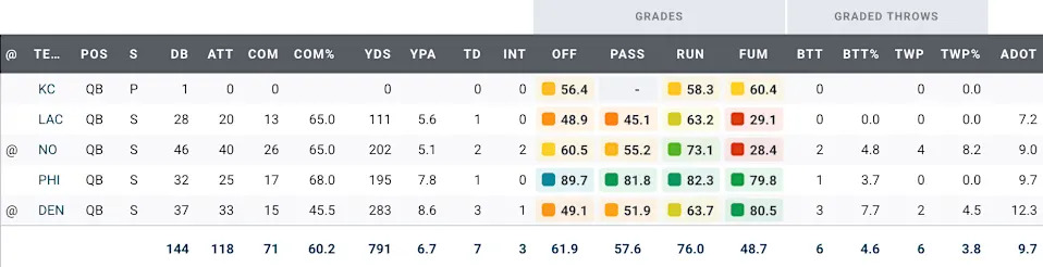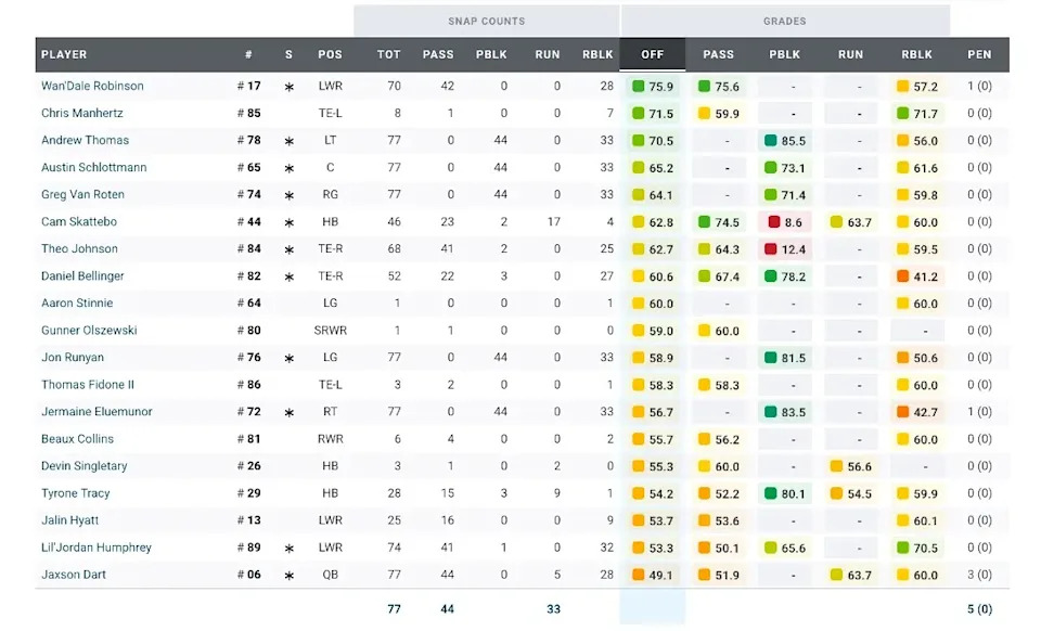 In fact, PFF has been mostly cool on rookie quarterback Jaxson Dart throughout his four starts — other than the Philadelphia game: