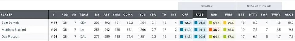 Now let’s look at PFF’s top three quarterbacks in passing grade: