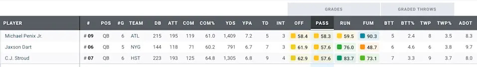 What’s the difference? All three have played one more game than Penix and Stroud, so for that reason alone we expect their yards and TDs to be a little higher. As we said before, though, PFF doesn’t grade the outcomes of plays, i.e., yards and TDs, at least not directly. They grade how well the quarterback did his job. That’s not the same thing, because a QB may throw a beautiful pass way downfield and the receiver drops it, and he may throw an awful pass that should be intercepted and the defensive back doesn’t come down with the interception. PFF loves explosive pass plays (20+ yards) and PFF hates turnovers. Sam Darnold, Matthew Stafford, and Dak Prescott have about twice as many TDs as Penix, Dart, and Stroud…but they have about three times as many “big-time throws (BTT),” PFF’s term for the long passes downfield or very accurate intermediate passes into tight windows that they judge to be the hallmark of great QBs.
