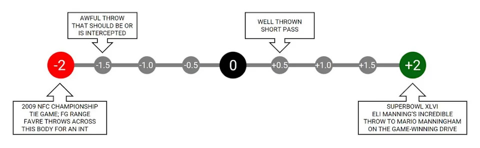 Here’s another, more recent article, written by one of their graders. As he points out, if a QB completes a 3-yard slant, he gets a zero grade. He did what was expected, nothing more, nothing less. Departures from zero are reserved for doing something beyond expectations, and especially in important situations. Their example above for the quintessential +2 grade, the highest they can give on a play, is Eli Manning’s Super Bowl throw to Mario Manningham. That play had everything: Beautiful throw, way downfield, placed right in between two defenders where only Manningham could catch it, but not leading him out of bounds…and the key play in winning that Super Bowl. According to the article, even the league-leading QBs throw passes that are positively graded only 25-30% of the time, and even that number doesn’t account for whether the positive grade is +0.5 or +2.0. The same applies in reverse to poorly thrown, negatively graded plays.