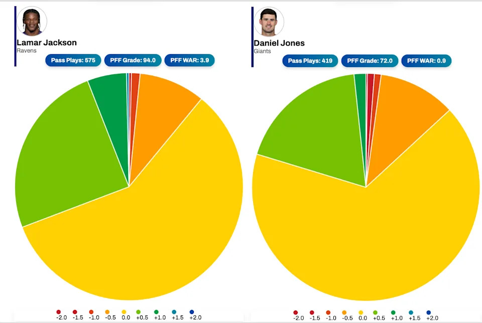 How PFF combines all those grades on individual plays into a final grade on a scale from 0-100 isn’t exactly clear, but the article I linked to above has an interactive tool for the 2024 season that gives us some insight into how the distribution of very bad to ordinary to very good throws leads to the final grade you see after each game. Here, for example, is how Lamar Jackson, PFF’s top-rated 2024 quarterback, compared to Daniel Jones, their third-lowest among starters: