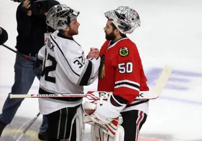 Jun 1, 2014; Chicago, IL, USA; Los Angeles Kings goalie Jonathan Quick (32) shakes hands with Chicago Blackhawks goalie Corey Crawford (50) after game seven of the Western Conference Final of the 2014 Stanley Cup Playoffs at United Center. Mandatory Credit: Dennis Wierzbicki-USA TODAY Sports