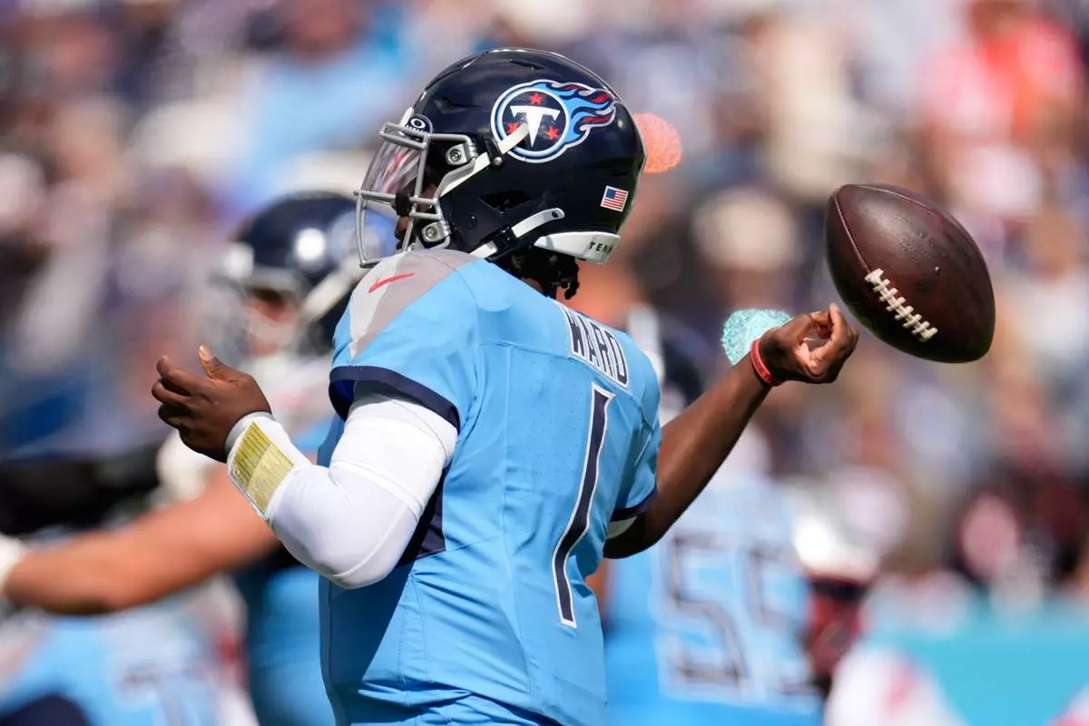 Tennessee Titans quarterback Cam Ward (1) fumbles during the second half of an NFL football game against the New England Patriots, Sunday, Oct. 19, 2025, in Nashville, Tenn. (AP Photo/George Walker IV)