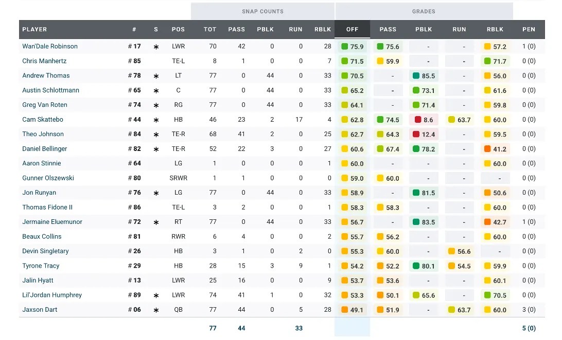 In fact, PFF has been mostly cool on rookie quarterback Jaxson Dart throughout his four starts — other than the Philadelphia game: