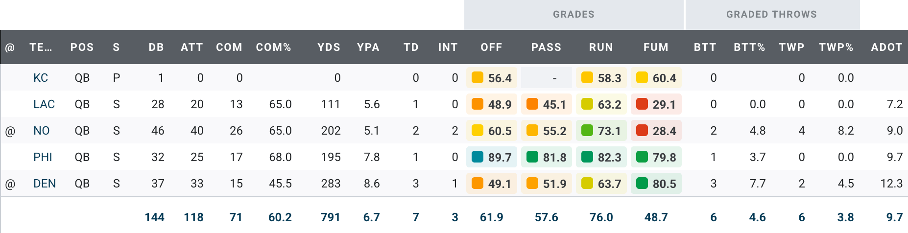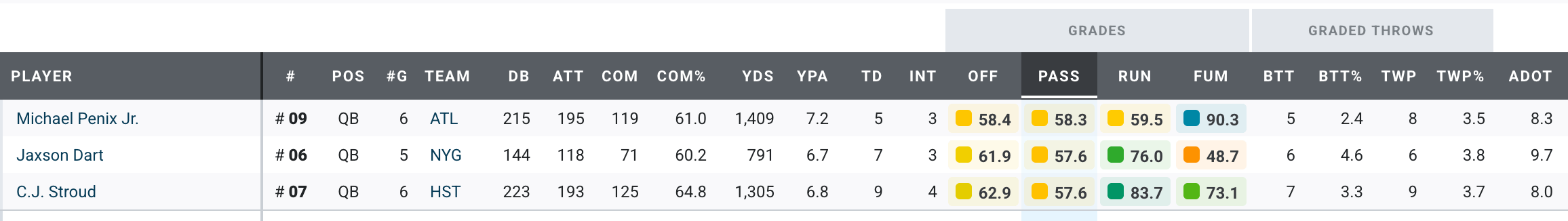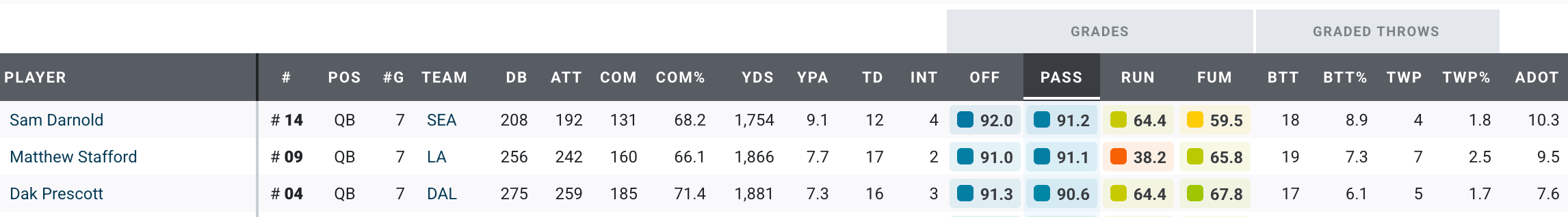 Now let’s look at PFF’s top three quarterbacks in passing grade: