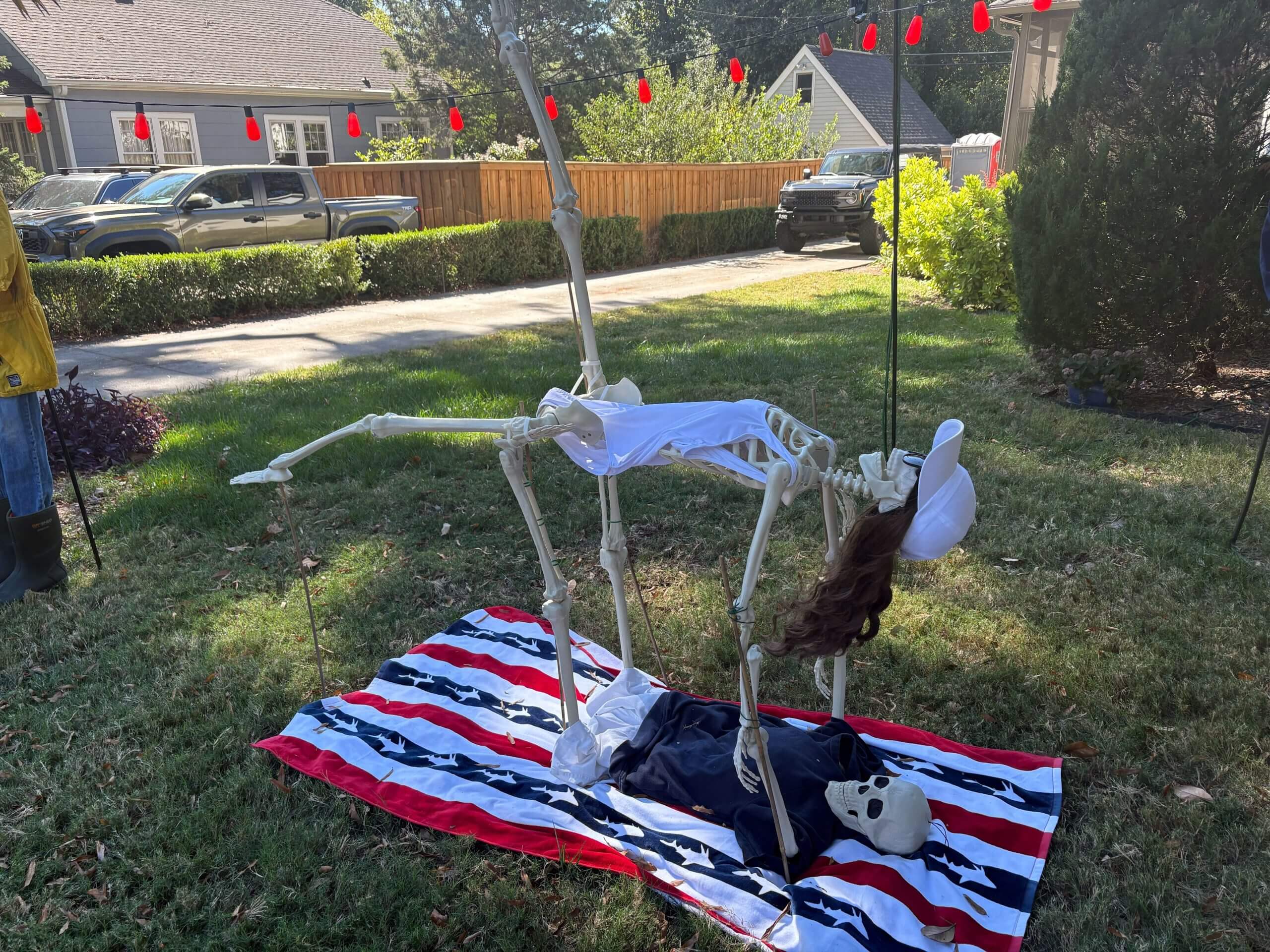 This October, his modest front yard features a skeleton in a yellow jacket holding a fishing rod next to a skeleton mermaid. There’s also a skeleton on a beach towel, holding another skeleton in the air with its feet. Elsewhere in the yard, a gray-haired skeleton in a blue Navy sweatshirt sits in a chair, next to a skeleton posing as a reporter with a microphone.