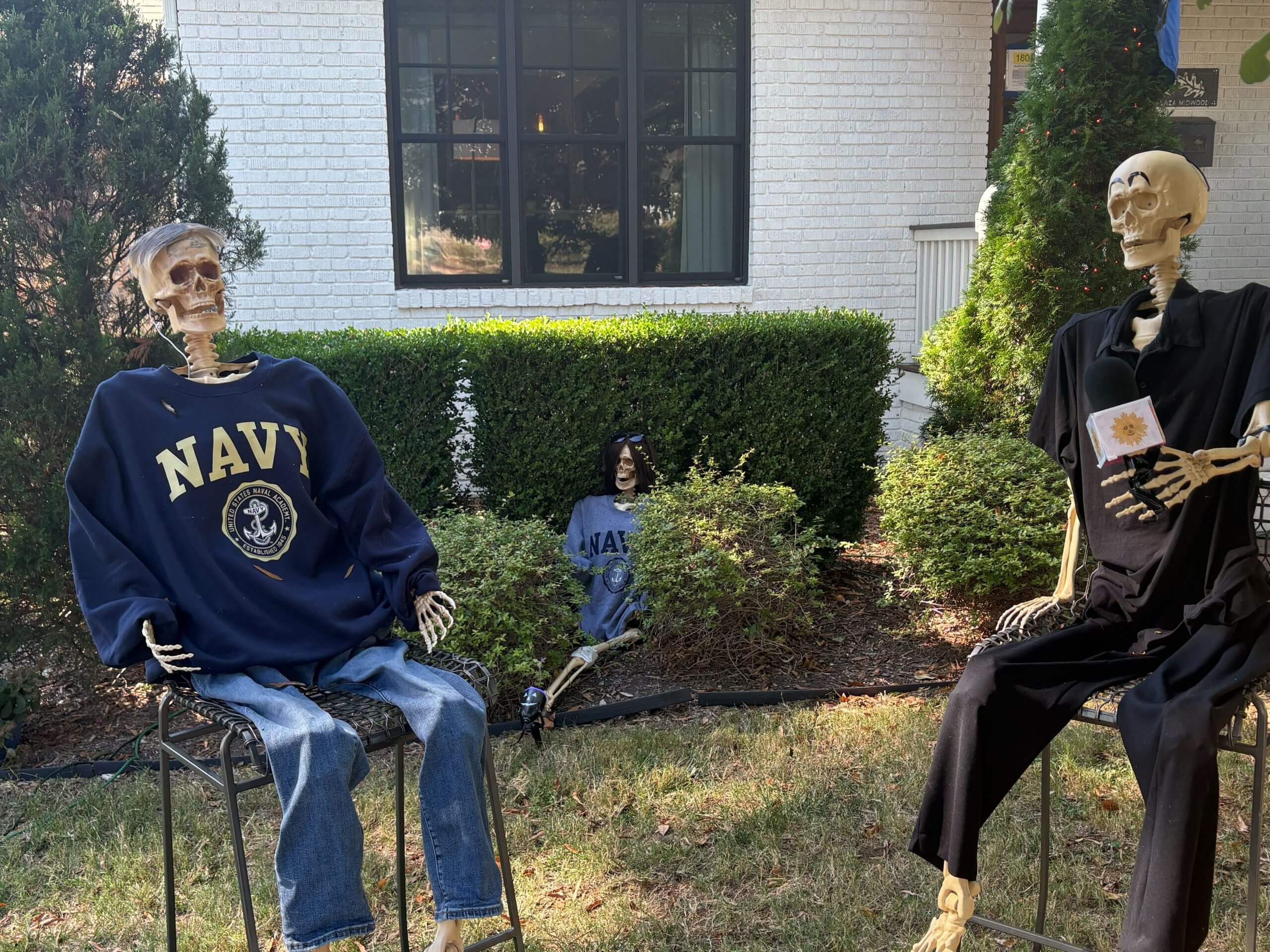 Behind them, in the bushes, a skeleton in a gray Navy sweatshirt lurks. And near a door, there’s a shirtless skeleton leaving the house — bag over shoulder and thermos in hand.