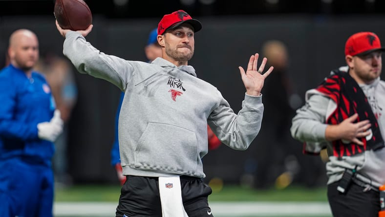 Dec 22, 2024; Atlanta, Georgia, USA; Atlanta Falcons quarterback Kirk Cousins (18) warms up on the field prior to the game against the New York Giants at Mercedes-Benz Stadium. Mandatory Credit: Dale Zanine-Imagn Images