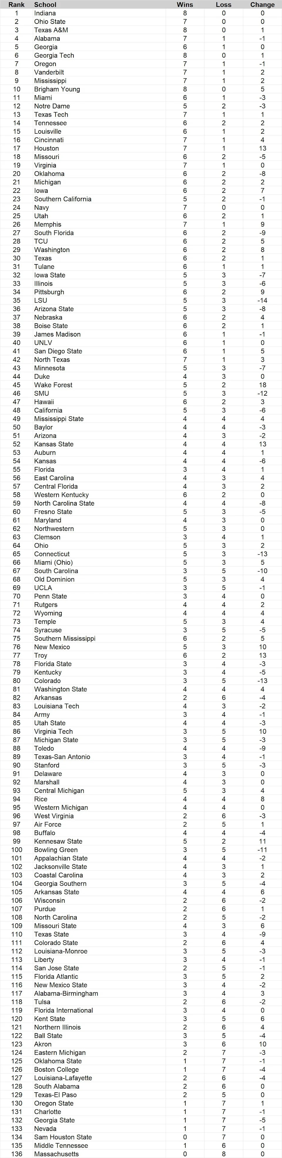 Also in the Big 12, Houston is up 13 spots to No. 17 after beating Arizona State. Houston has already topped last year’s win total and are tied with Texas Tech for second place in the conference standings, though the Red Raiders own the head-to-head tiebreaker. Kansas State is up to No. 52 after moving to 4-4 with a blowout of rival Kansas.