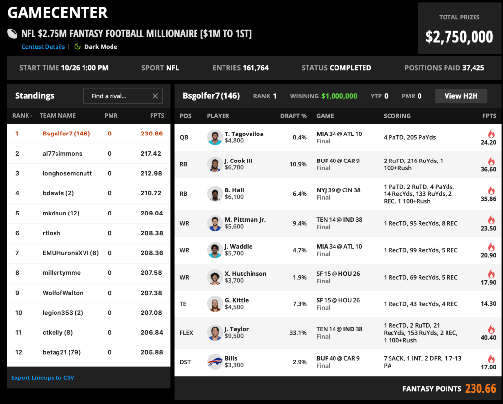 Tua had a miniscule 0.4% ownership in the Milly Maker, but he delivered in a huge way for the few managers who believed in him. He posted 205 passing yards and four touchdowns, including this long score to Jaylen Waddle (20.9 FPTS), who was also a part of Bsgolfer7’s high-scoring entry.