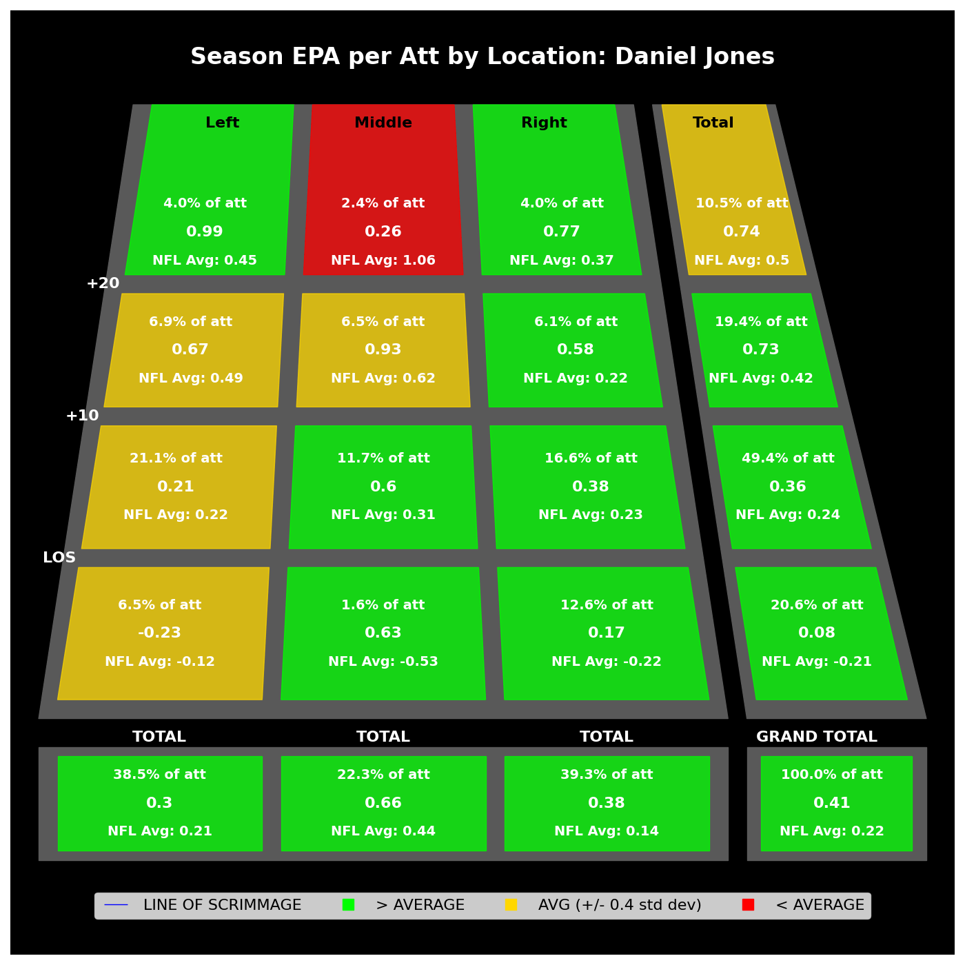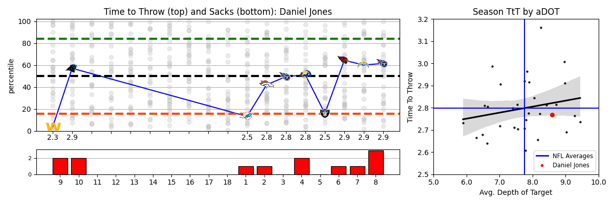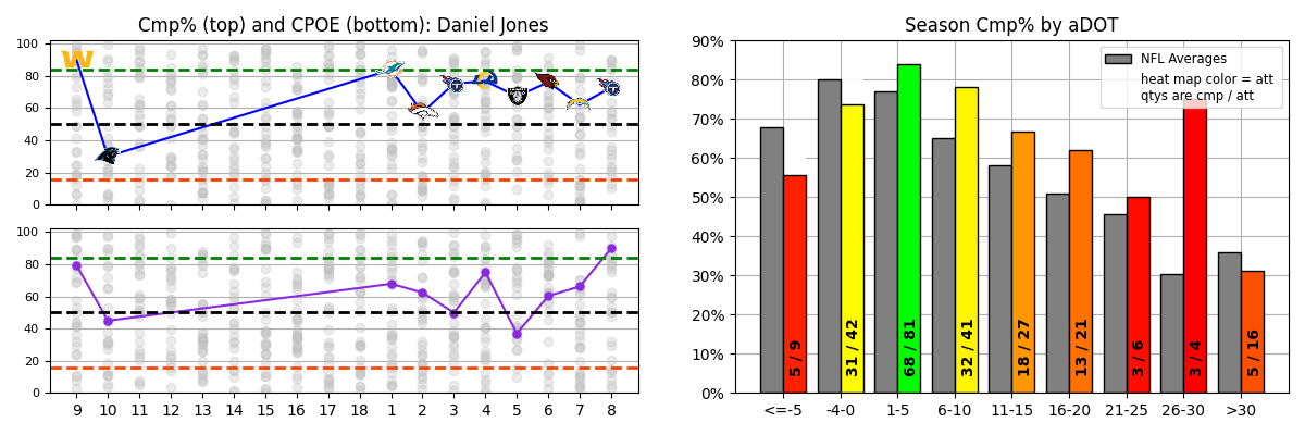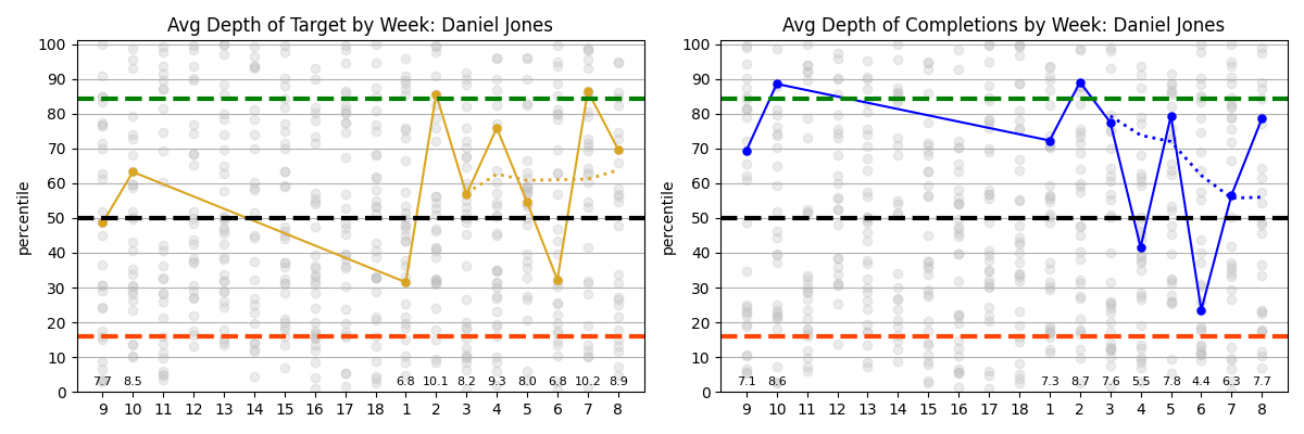 Accuracy (CPOE) jumped significantly this week, driven by Jones connecting on the deeper throws. Ironically, for the season, he’s actually below average on passes behind the line of scrimmage — but he more than makes up for it on throws up to 30 yards downfield.