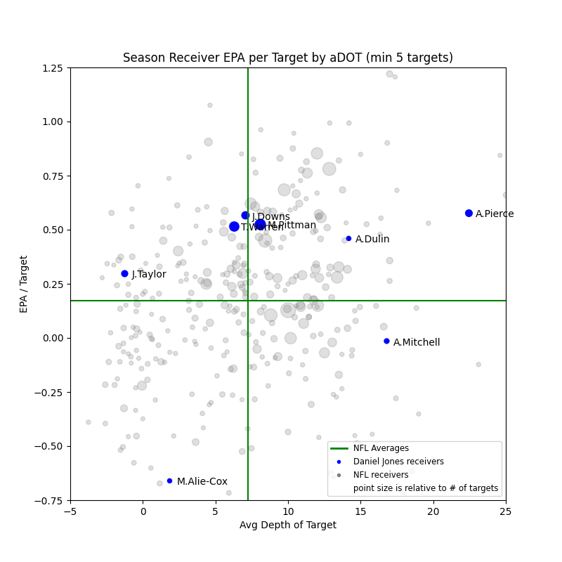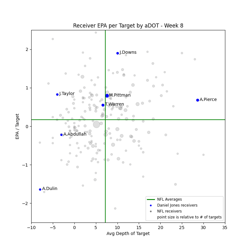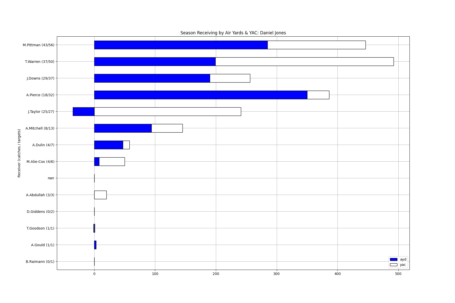 Both Pittman and Pierce had big days, nearly matching each other in total receiving depth, but Pittman added a lot more YAC. Warren continues to impress as Jones spreads the ball around nicely.