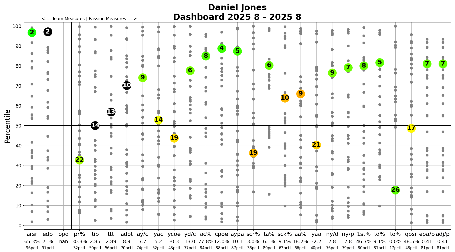 I think I could just copy and paste my comments from previous weeks, because Jones keeps delivering the same consistently strong performances. In Week 8, he was once again a top-10 QB in EPA efficiency and success rate, minimizing mistakes and mixing in high-impact plays to keep the NFL’s best offense rolling.