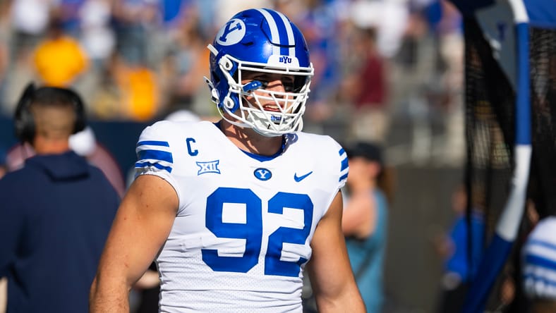 Nov 23, 2024; Tempe, Arizona, USA; Brigham Young Cougars defensive end Tyler Batty (92) against the Arizona State Sun Devils at Mountain America Stadium. Mandatory Credit: Mark J. Rebilas-Imagn Images