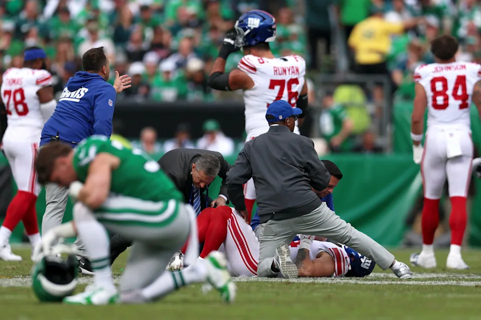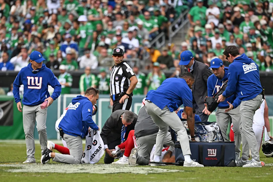 Medical staff attend to New York Giants running back Cam Skattebo after an injury on a play against the Philadelphia Eagles in the second quarter on Oct. 26, 2025 in Philadelphia.