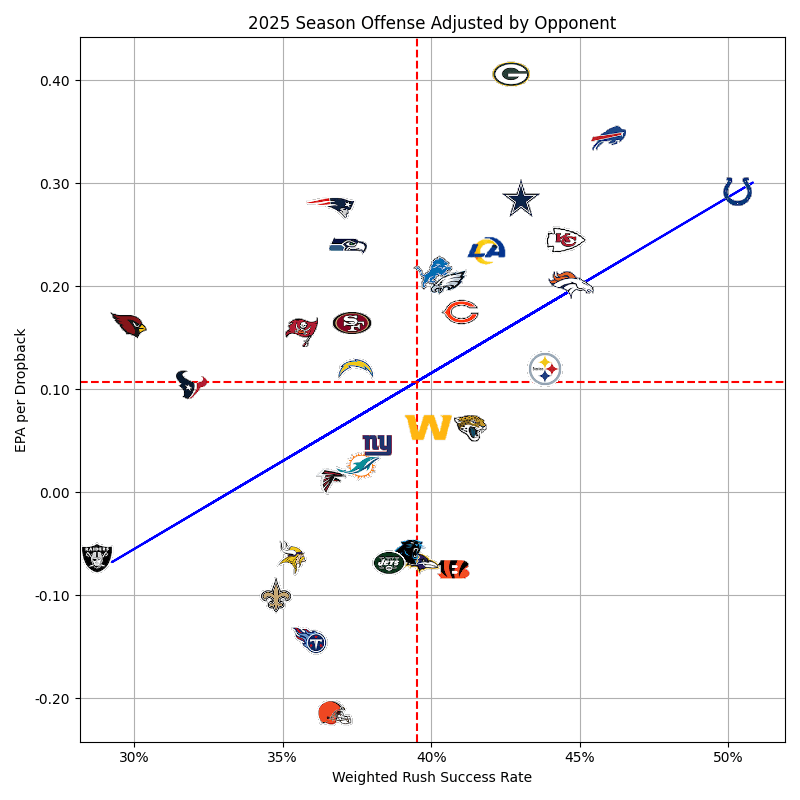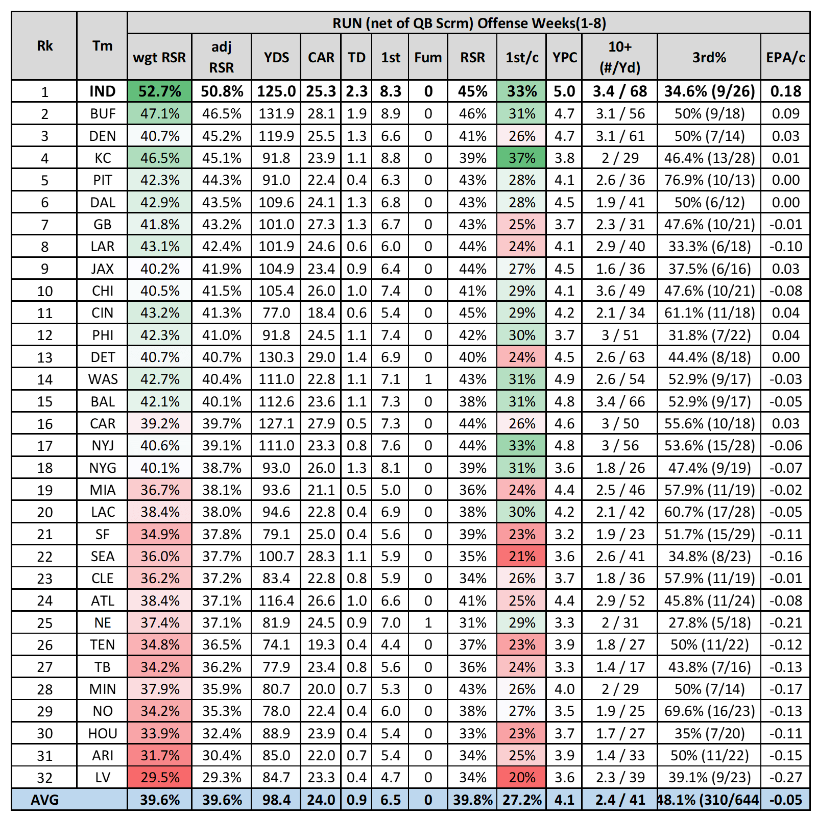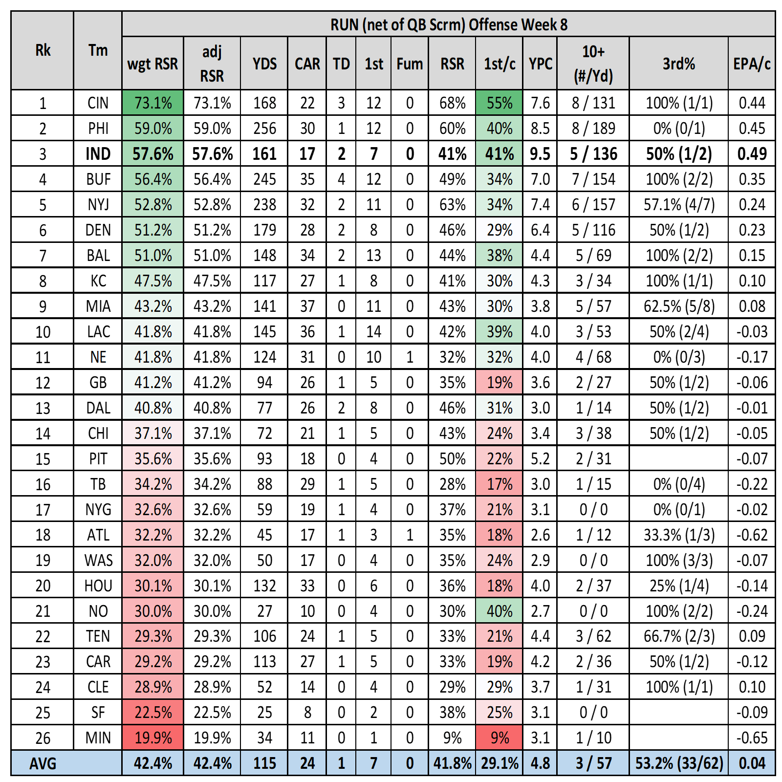 Thanks to J.T.’s 80-yard run, the Colts’ 9.5 yards per carry ranked #1 on the week. However, in terms of success rate, that 80-yarder counts as just a single successful play. So, by rush success rate, the Colts rank #2 — and after adjusting for situation, they end up in the #3 spot.