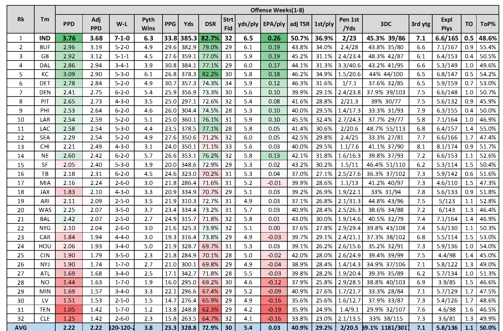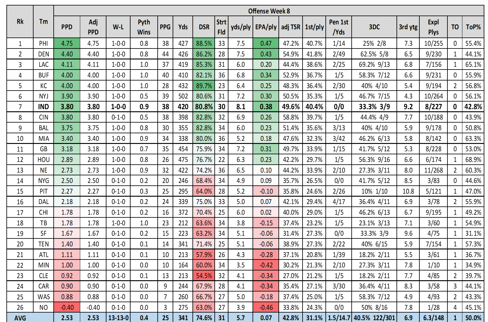 On the year, the Colts remain 1st in points per drive — both on a raw basis and after adjusting for opponent strength. Simply put, the Colts have the best offense in the NFL — and it’s not particularly close