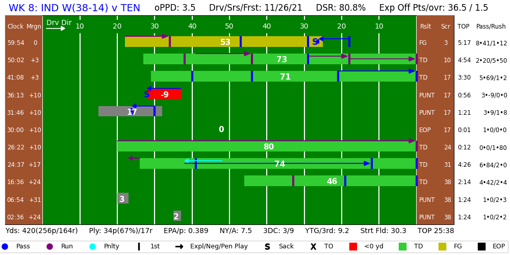 The Colts offense posted another 80+ Drive Success Rate with 26 first downs on the day. Considering they hit garbage time early, that actually understates how dominant the offense was.