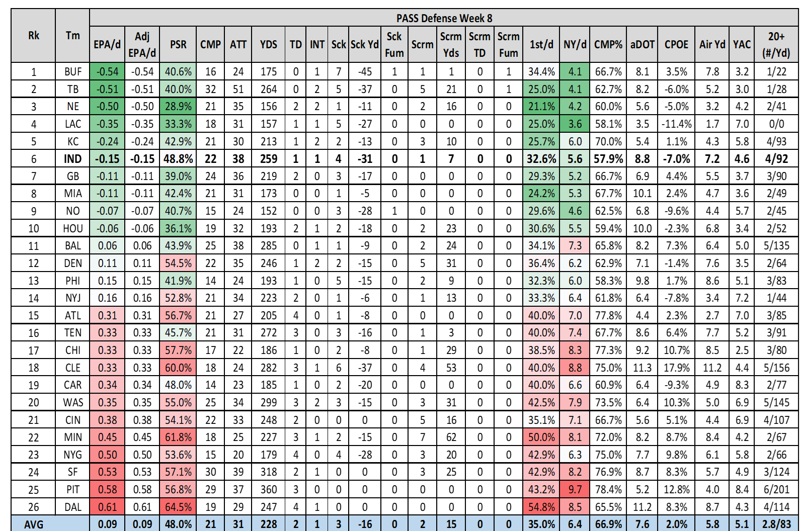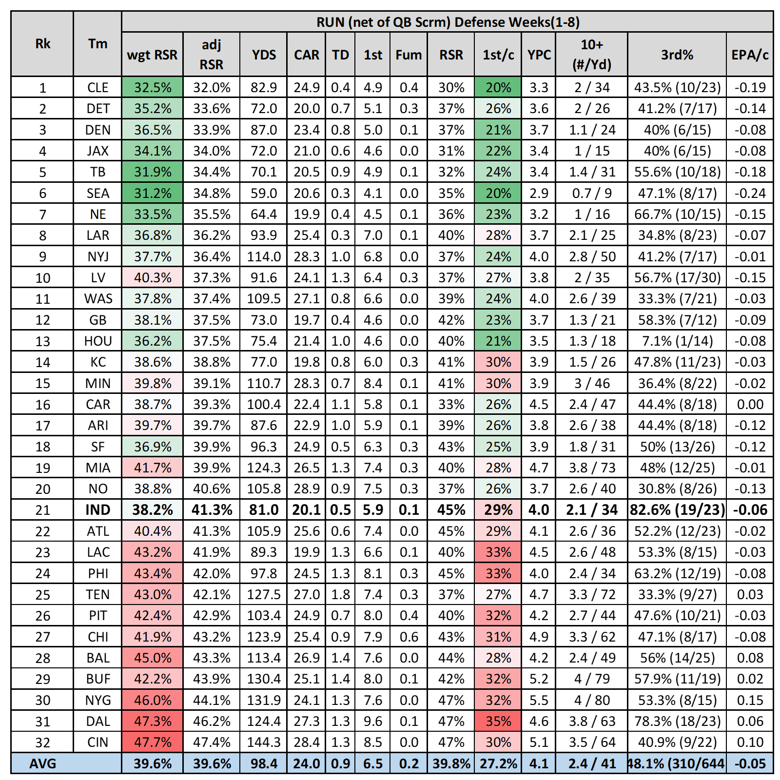 In a change of pace, the Colts defense was strong against the run. Although they allowed 4.4 yards per carry (8th most) and the 10th-highest EPA per carry, they kept a lid on first downs, holding Tennessee to the 7th-lowest run-play conversion rate of the week. Adjust for situation, and that translates to the 5th-best defensive weighted Rush Success Rate in Week 8.