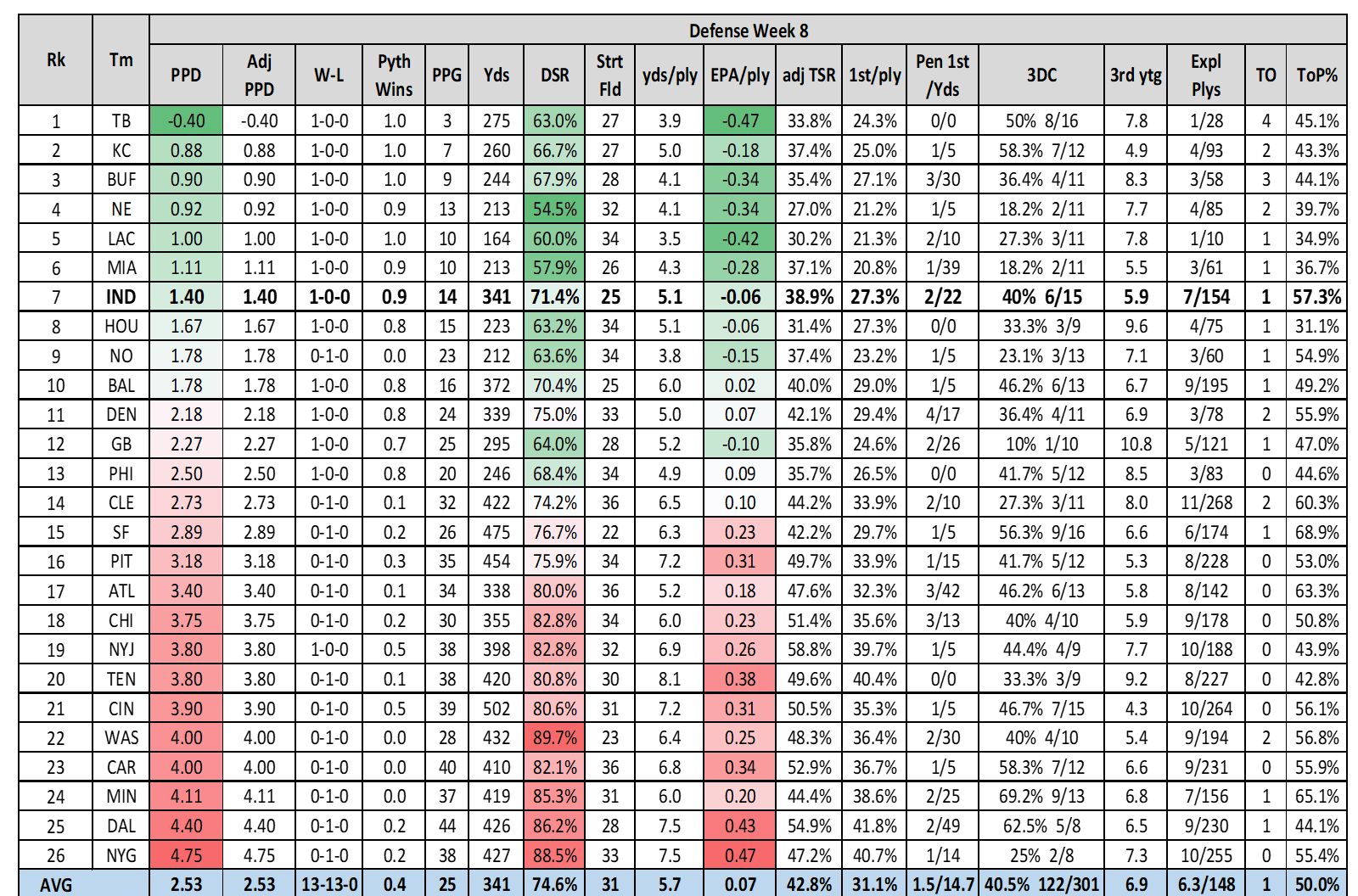 Looking across all games, the Colts defense appears strong on the surface — holding opponents to the 6th-lowest points per game — but that figure is highly misleading. Points per Drive is a far more predictive measure of future performance, and by that metric, Indianapolis drops to 15th.