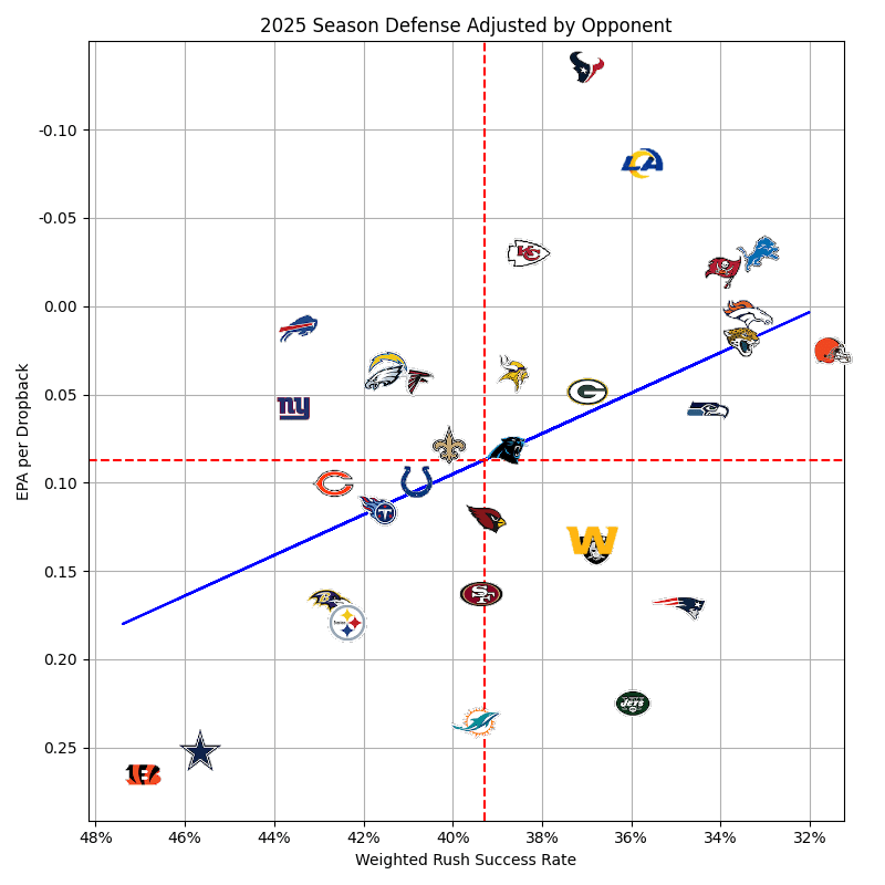 The Colts held the Tennessee passing game in check, limiting Cam Ward to the 6th-worst EPA per dropback. His Success Rate was slightly better (14th-worst), but his red-zone interception tanked his efficiency. He also posted the 9th-worst yards per dropback and the 10th-worst pass play conversion rate. I’d comfortably call that a top-10 defensive performance against one of the worst passing teams in the NFL.