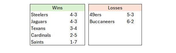 The Commanders are -5 on the season, but Marcus Mariota has thrown 3 of the team’s 5 INTs and lost 1 fumble. While Daniels had a bad day vs Chicago, with 2 fumbles and his lone interception of the season, his only other turnover was on the fumble that occurred when he was injured on a tackle in the 3rd quarter of the loss to Dallas.