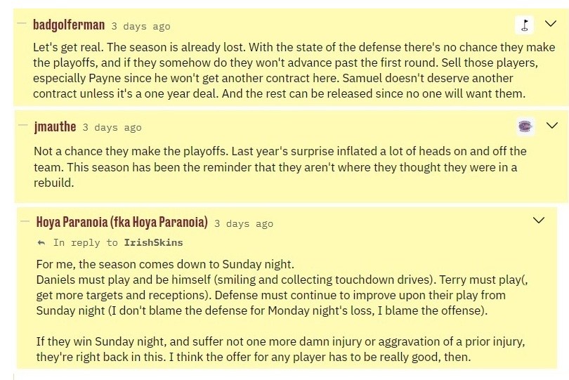 This might illustrate what the eight-percenters are thinking about. A win this week would leave the Commanders just one game below .500 with 8 games to play. Basically, if you have the ‘Any given Sunday’ mentality, the season still holds lots of possibilities.