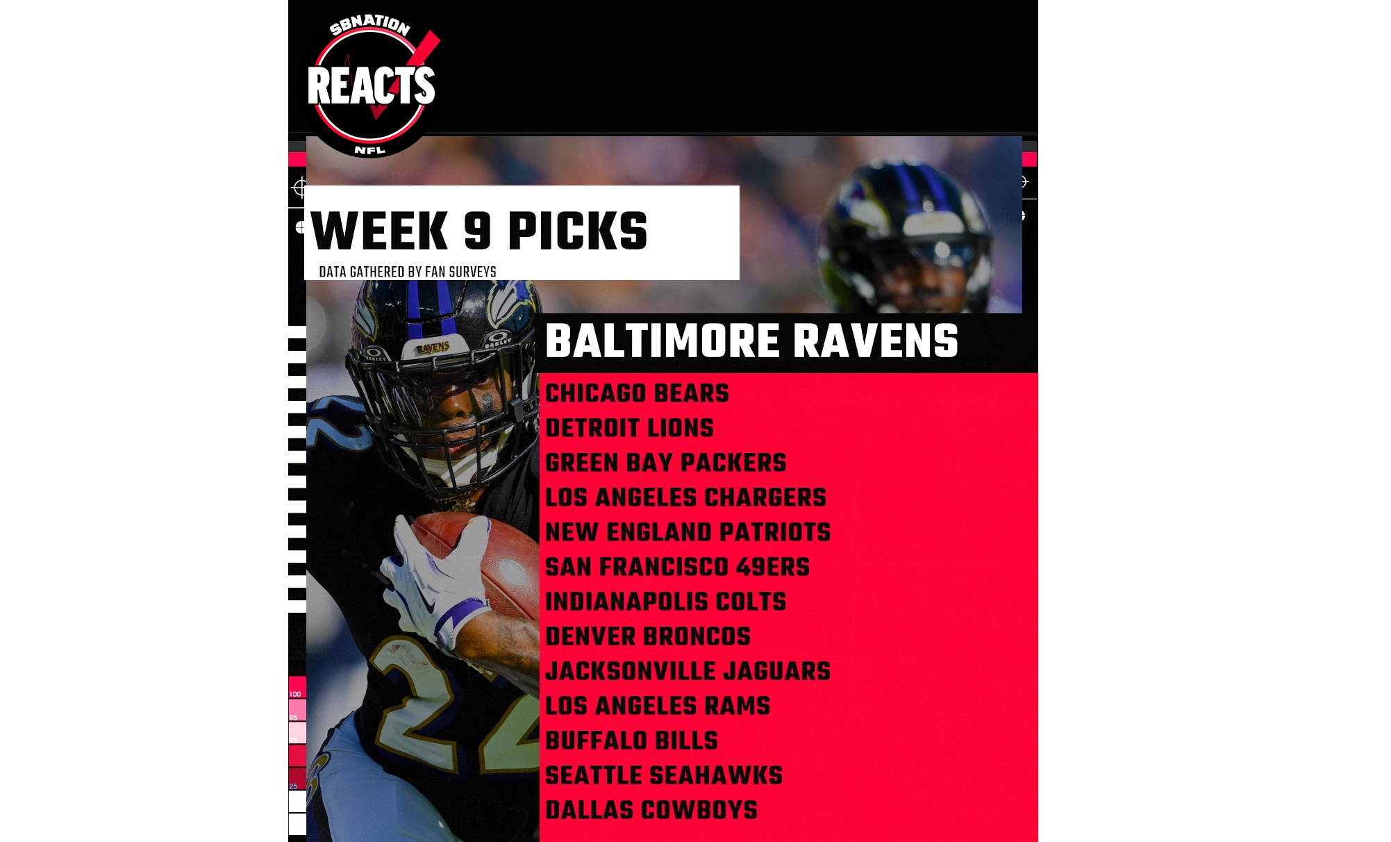 Each week, SB Nation polls fans of all 32 fan bases by email; in that survey, NFL fans from across the breadth of the league predict winners and losers.