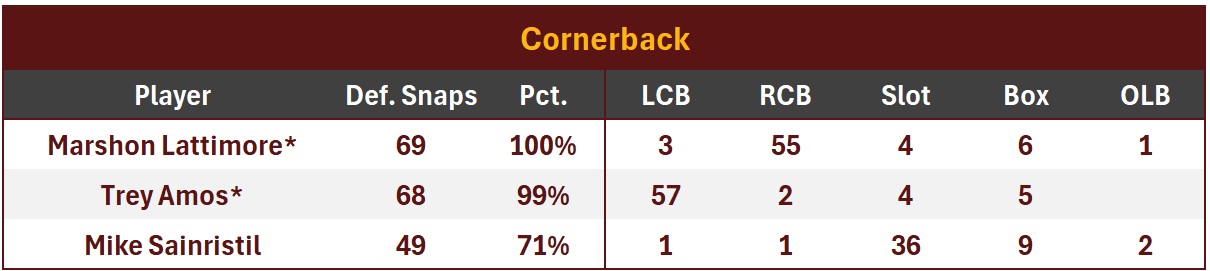 Marshon Lattimore played his best game as a Commander, effectively shutting down receivers in his coverage and making plays on the ball. In 43 coverage snaps, PFR counted 1 rec/2 tgt for 25 yds (0.58 Y/Cov Snap). PFF counted 1 tgt and 0 rec (0 Y/Cov Snap). He also made 1 interception and 1 PBU.